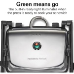 GREEN MEANS GO: For best results, preheat sandwich maker 6 minutes before use. Built-in ready light will turn green when the press is ready to cook your sandwich.