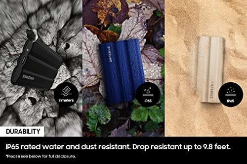 Samsung T7 Shield Portable SSD delivers high performance on-the-go, not matter the terrain. It has an IP65 rating for water** and dust* resistance, with Dynamic Thermal Guard to manage heat control. Transfer huge files instantly. USB 3.2 Gen 2 and PCIe® NVMe™ achieve soaring sequential read/write speeds of up to 1,050/1,000 MB/s***, allowing you to edit directly from the drive. The rugged design and advanced outer elastomer add extra durability to even endure a 9.8 foot drop****. The T7 Shield is compatible with PC, Mac, Android devices, gaming consoles, and more*****. Included in the box are USB Type C-to-C and Type C-to-A cables****** for added convenience. Comes with a 3 Year warranty.*Consistent with IP65 rating, tested under controlled conditions: 2kg/m3 of active dust with a pressure under 2kPa for 8 hours. Dust resistant capabilities may vary depending on the actual conditions. **Consistent with IP65 rating, tested under controlled conditions: water flow of 100kPa for 3 minutes. Water resistant capabilities may vary depending on the actual conditions. ***Performance may vary depending on host configuration. To reach maximum read/write speeds of up to 1,050/1,000 MB/s, respectively, the host device and connection cables must support USB 3.2 Gen 2 and the UASP mode must be enabled. Test system configuration: ASUS Z270 ROG MAXIMUS IX HERO (USB 3.2 Gen2 Type-C), Intel(R) Core(TM) i7-7700K CPU @ 4.20GHz, OS- Windows 10 19H2. ****Tested to withstand 9.8-ft (3 meters) drop under controlled conditions. Drop resistance capability may vary depending on the actual environmental conditions. *****Compatibility with host devices may vary. Some operating systems may require T7 Shield reformatting. ******T7 Shield is compatible with USB 3.0 and USB 2.0. *******Source: 2003~2021 OMDIA data: NAND suppliers’ revenue market share.
