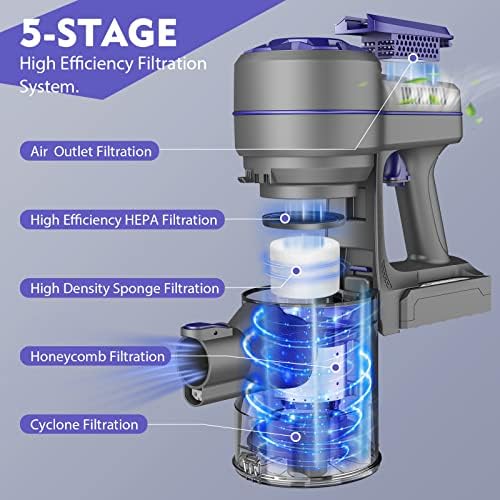♻【Upgraded HEPA Filtration System】: Our cordless vacuum adopts a 5-stage high-efficiency filtration system, which can effectively capture 99.99% of tiny dust particles and avoid secondary pollution. It can provide purified air for your family. (Note: HEPA is washable, cleaning the filter regularly will prevent suction loss and clogging.)